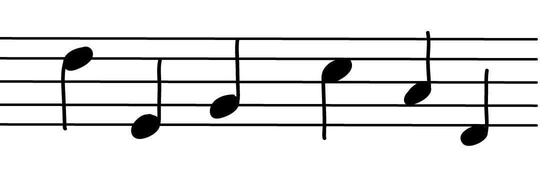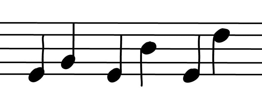 Next, thirds. Any space note to the nearest space note, up or down, is a third (skips the second), and the same follows for line notes. Here is third-up, third-down, then third-down, third-up.