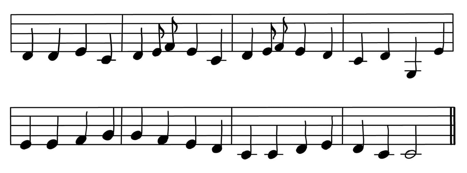 The bar lines divide the notes into sets of four per measure. The first note in each set is louder; it sounds like one-two-three-four-one-two-three-four, with no pauses or gaps at the bar lines. The notes are called quarter notes. Notes with holes in them last twice as long and are half notes. A four-four symbol (written with one four above the other) at the beginning of the first line of music is the time signature, and it tells you there are four quarter notes per measure throughout.